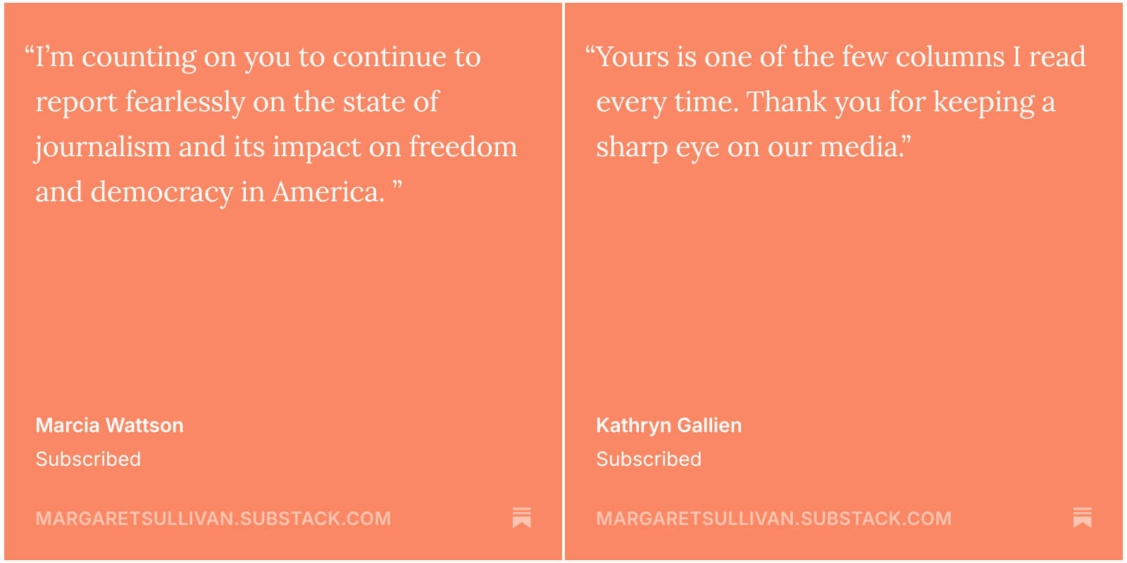 My background: I am a Lackawanna, NY native who started my career as a summer intern at the Buffalo News, my hometown daily. After years as a reporter and editor, I was named the paper’s first woman editor in chief in 1999, and ran the 200-person newsroom for almost 13 years. Starting in 2012, I served as the first woman “public editor” of the New York Times — an internal media critic and reader representative — and later was the media columnist for the Washington Post. These days, I write here on Substack, as well as for the Guardian US. I’ve also written two books, taught journalism ethics, and won a few awards, including three for defending First Amendment principles.