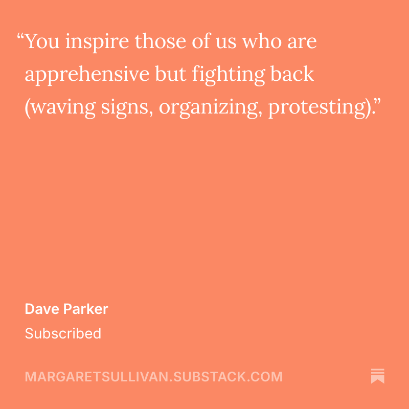 What I ask of you: Last fall, I removed the paywall so that everyone could read and comment. I thought it was important in this dire moment and might be helpful. If you are able to subscribe at $50 a year or $8 a month, or upgrade your unpaid subscription, that will help to support this venture — and keep it going for all. Thank you!