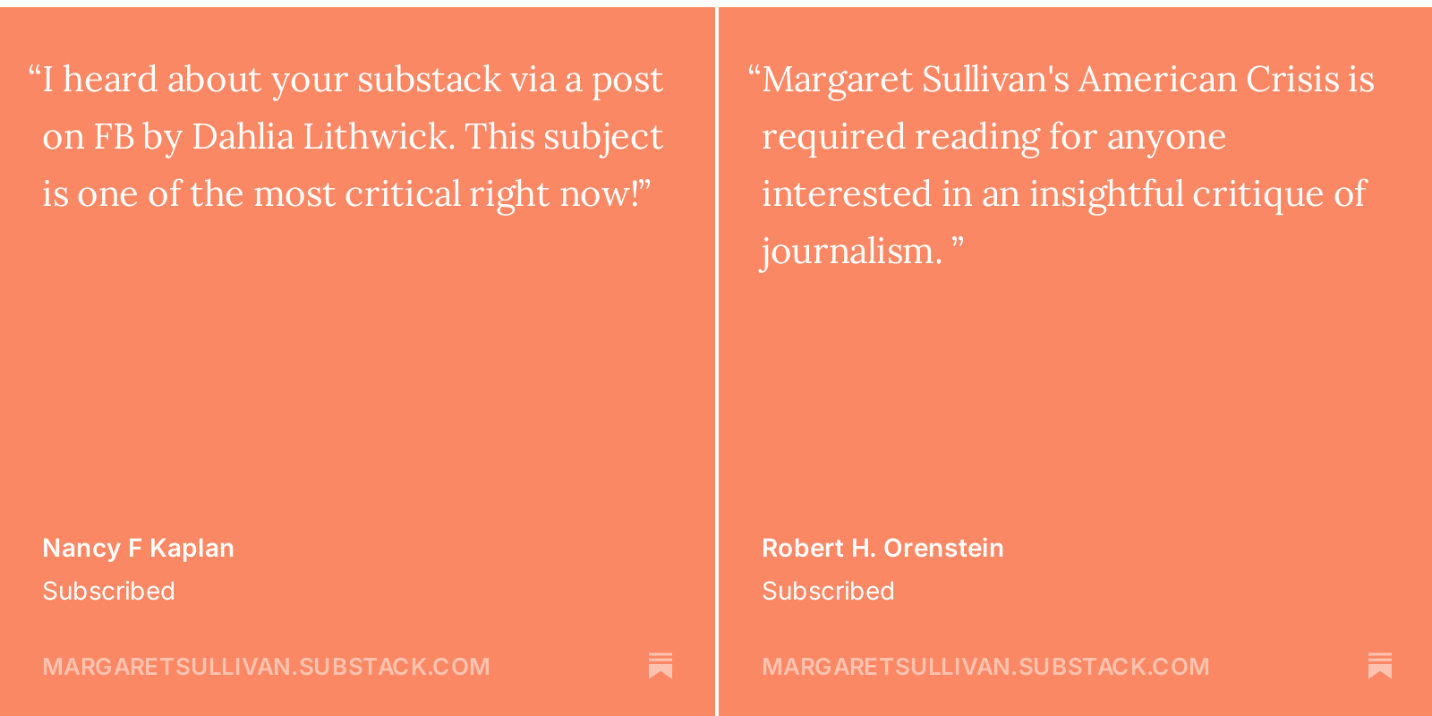 — bring attention to the journalism that serves democracy. There’s still plenty of that being published whether on major news sites, in local outlets, or by individuals on platforms like Substack. When it’s good, I plan to shout it out.