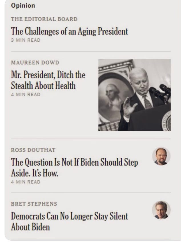 And then there was the rundown of Times opinion offerings — one piece after another, all in a neat row, about Biden’s age and memory.
