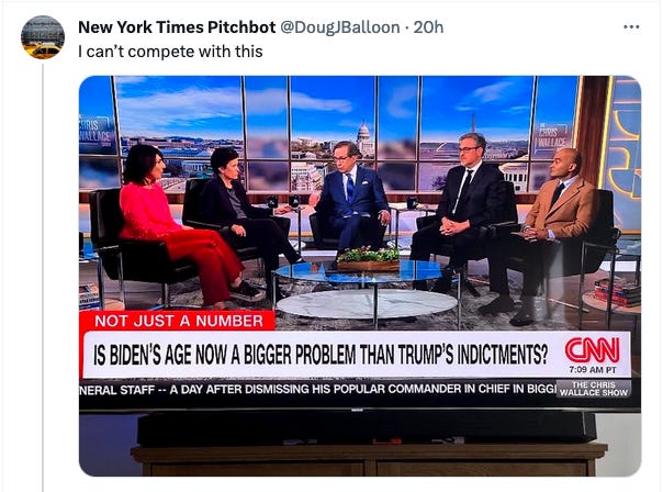 CNN, meanwhile, was running this chyron: “Is Biden’s Age Now a Bigger Problem Than Trump’s Indictments?” A panel gave this question every due consideration, and then some.