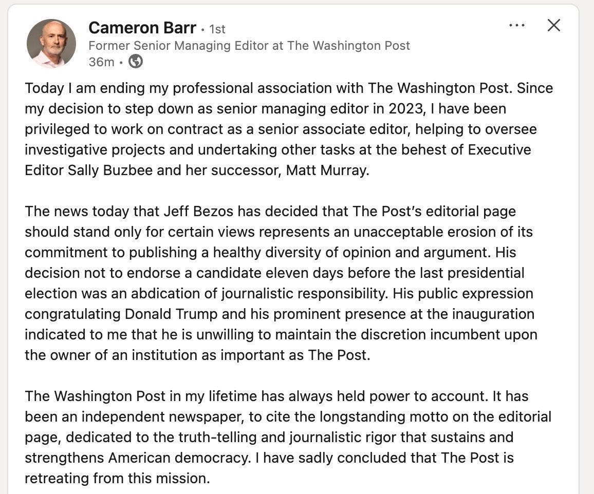 Here is a statement published Wednesday on LinkedIn from a longtime, high-ranking Post editor, Cameron Barr, who was Baron’s deputy and has continued to work on projects there in recent years.